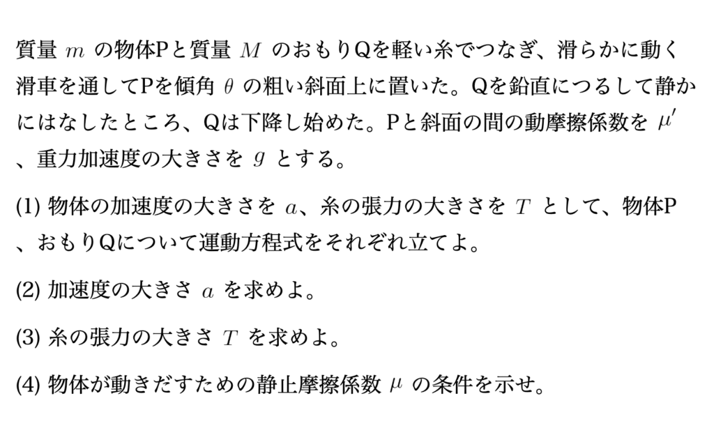 62 質量 $m$ の物体Pと質量 $M$ のおもりQを軽い糸でつなぎ、滑らかに動く滑車を通してPを傾角 $\theta$ の粗い斜面上に置いた。Qを鉛直につるして静かにはなしたところ、Qは下降し始めた。Pと斜面の間の動摩擦係数を $\mu’$、重力加速度の大きさを $g$ とする。