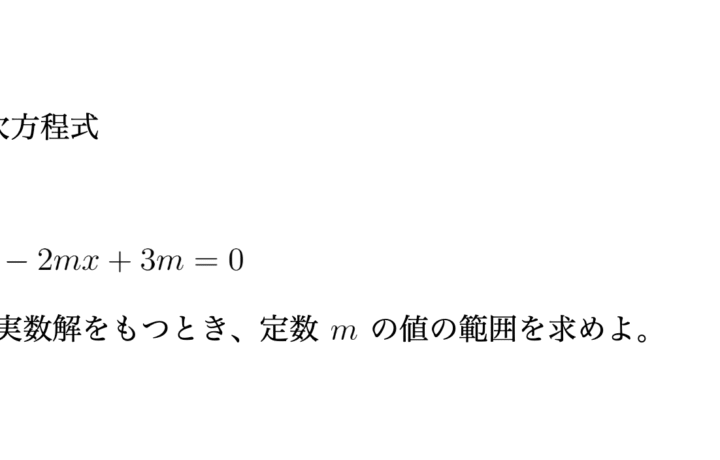$$x^2 – 2mx + 3m = 0$$ が実数解をもつとき、定数 $m$ の値の範囲を求めよ。